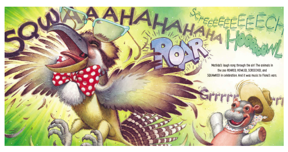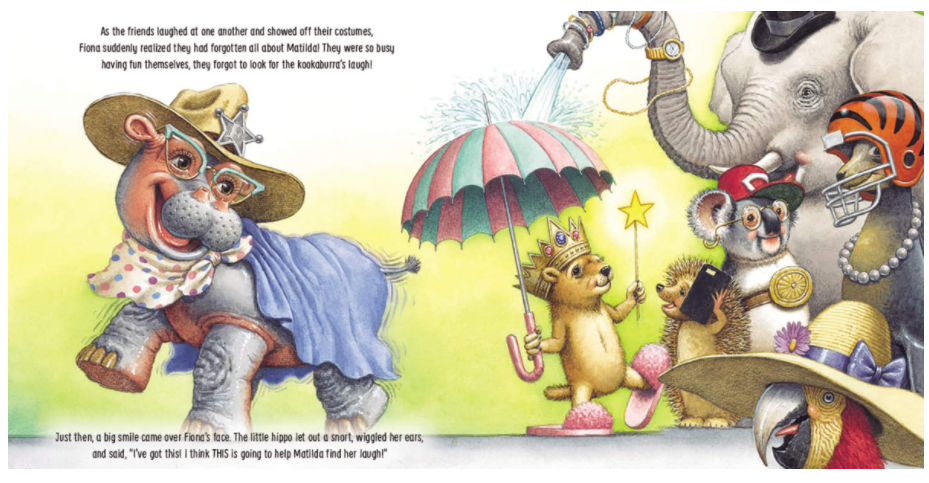 Fiona cannot figure out why the zoo seems so quiet as she wanders around, saying hello to all her friends. When she realizes she hasn’t heard Matilda the Kookaburra’s laughter in a while, Fiona and the other animals set out to find the missing laugh—and run right into a wonderful box of lost and found items. Their search turns into a dress-up party filled with laughter—and a great idea on how to get Matilda’s laugh back!